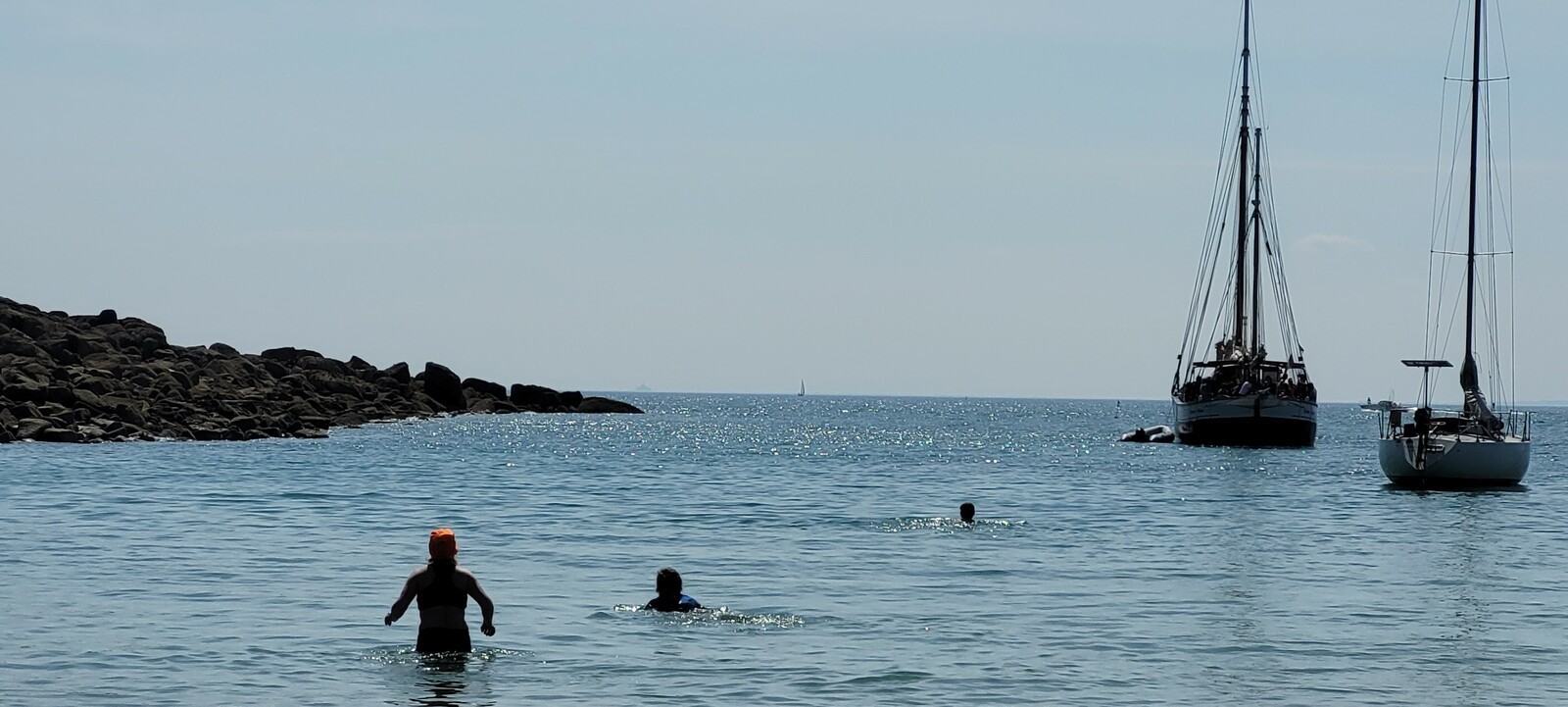 La météo fut bien meilleure que ce qui était prévu depuis quelques jours. Le vent était plutôt faible (~10 km/h) et de direction Est et donc nous poussait vers Chausey. La mer était plate, le soleil éclatant, la température à 25°C , si bien que nous avons dû rapidement enlever nos vestes pour ne garder sur le dos que nos magnifiques maillots orange fluo.